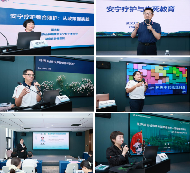 下午场由冯娟教授主持。湖北省抗癌协会秘书长、湖北省肿瘤医院王惠芬系统解读了2025年出台的与安宁疗护相关指南,明确规范诊疗标准;Mindy Wen指导终末期患者的社会心理评估与干预;湖北省肿瘤医院黄燕华分享家属哀伤辅导方法;美国执业物理治疗师Janet WahLee与Gary Lee传授从业者自我照护技巧,通过呼吸调整、运动处方等实操训练,指导学员掌握自我压力管理技能;南京和怡府山安宁疗护中心纪光伟主任以“社区开展安宁疗护大有可为”为题,为学员拓展基层服务思路。