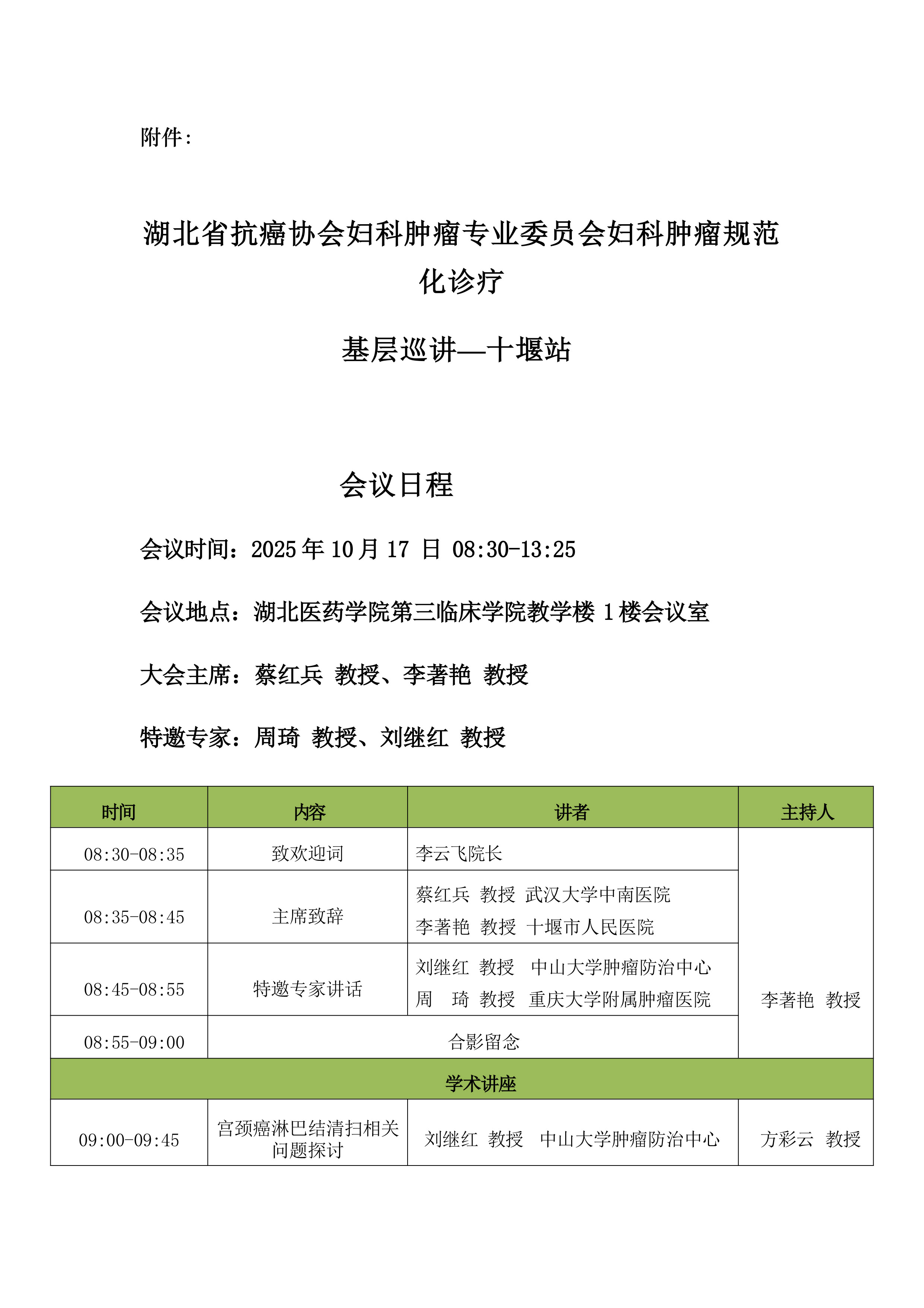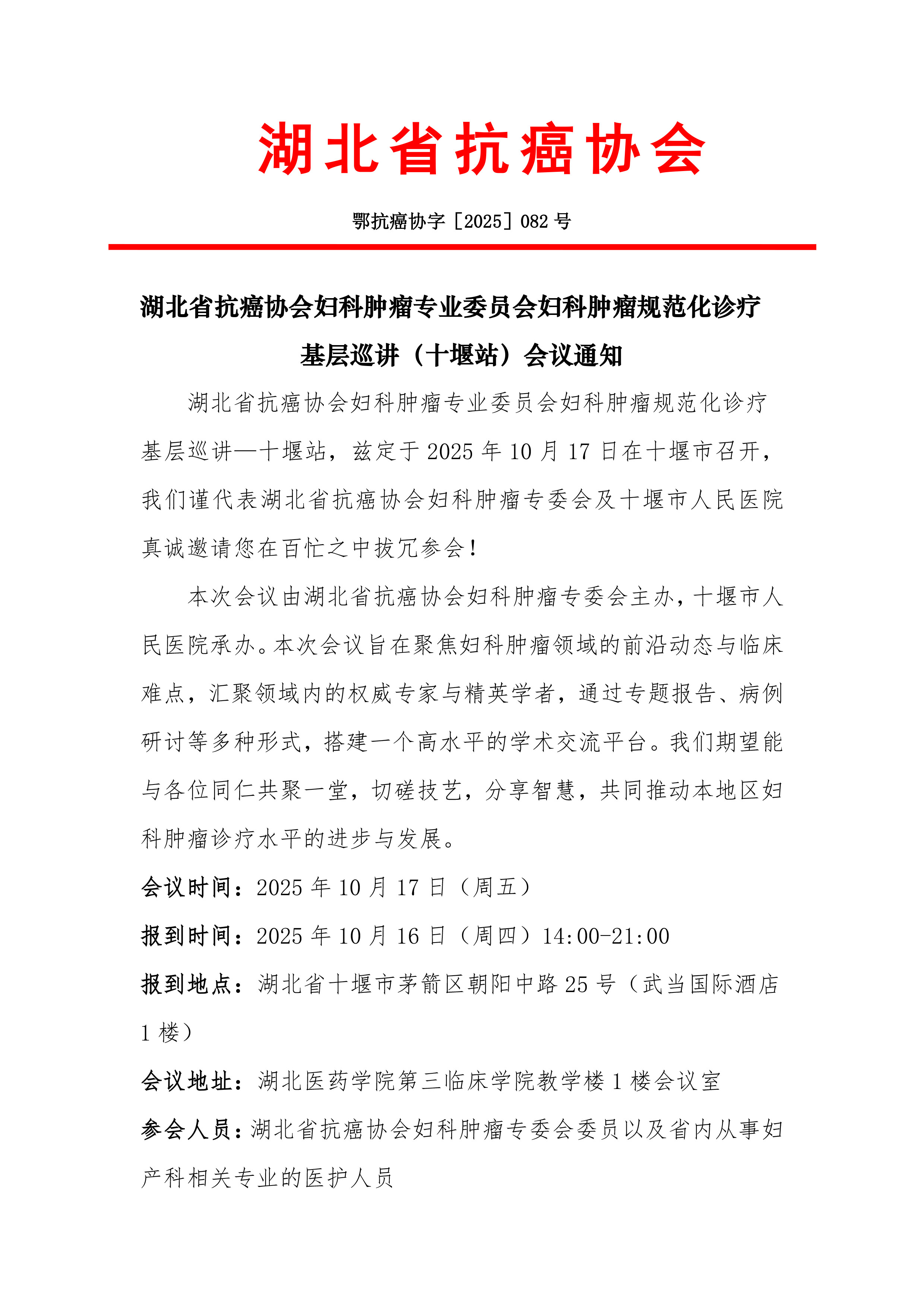 湖北省抗癌协会妇科肿瘤专业委员会妇科肿瘤规范化诊疗基层巡讲(十堰站)会议通知