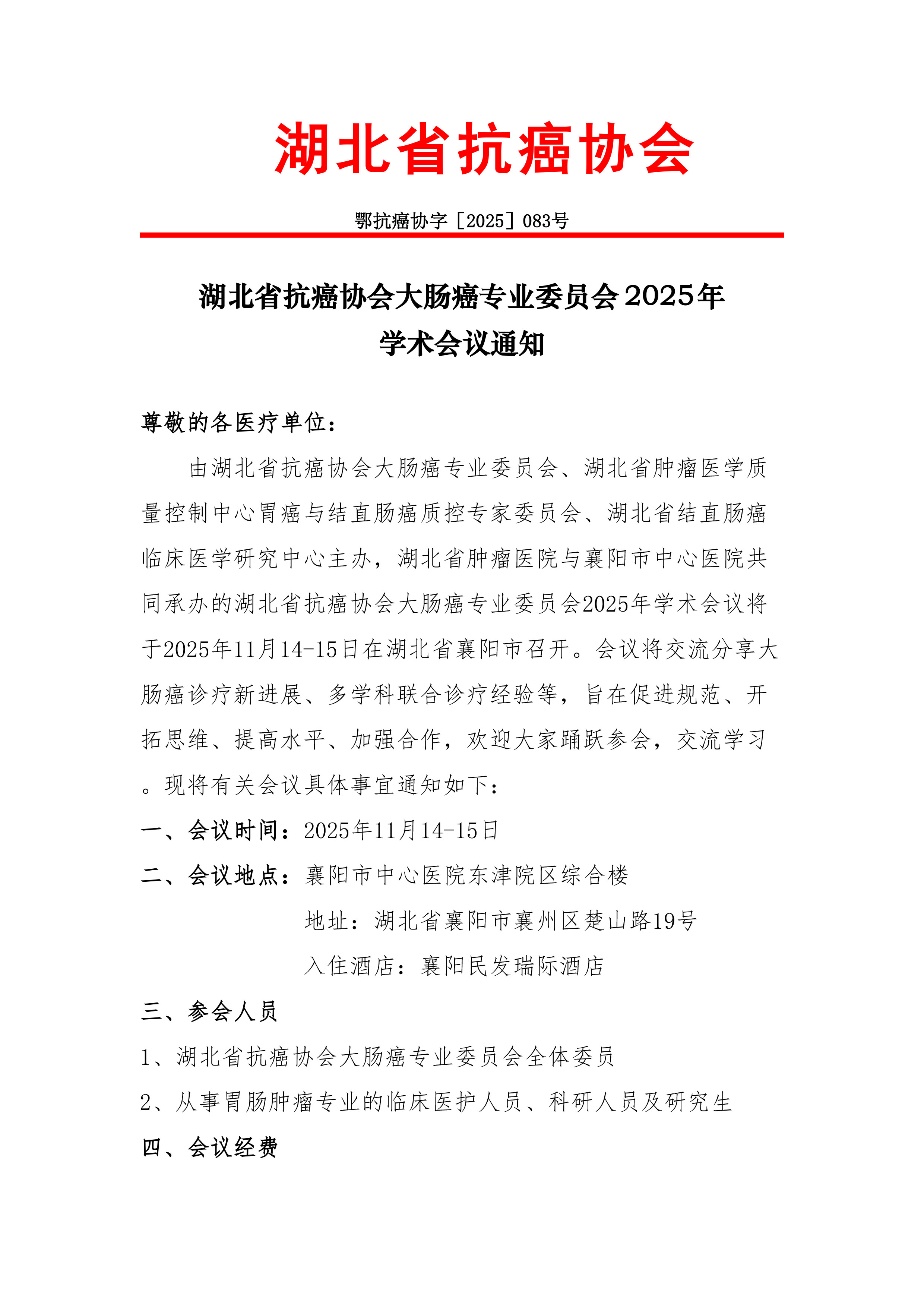 湖北省抗癌协会大肠癌专业委员会2025年学术会议通知