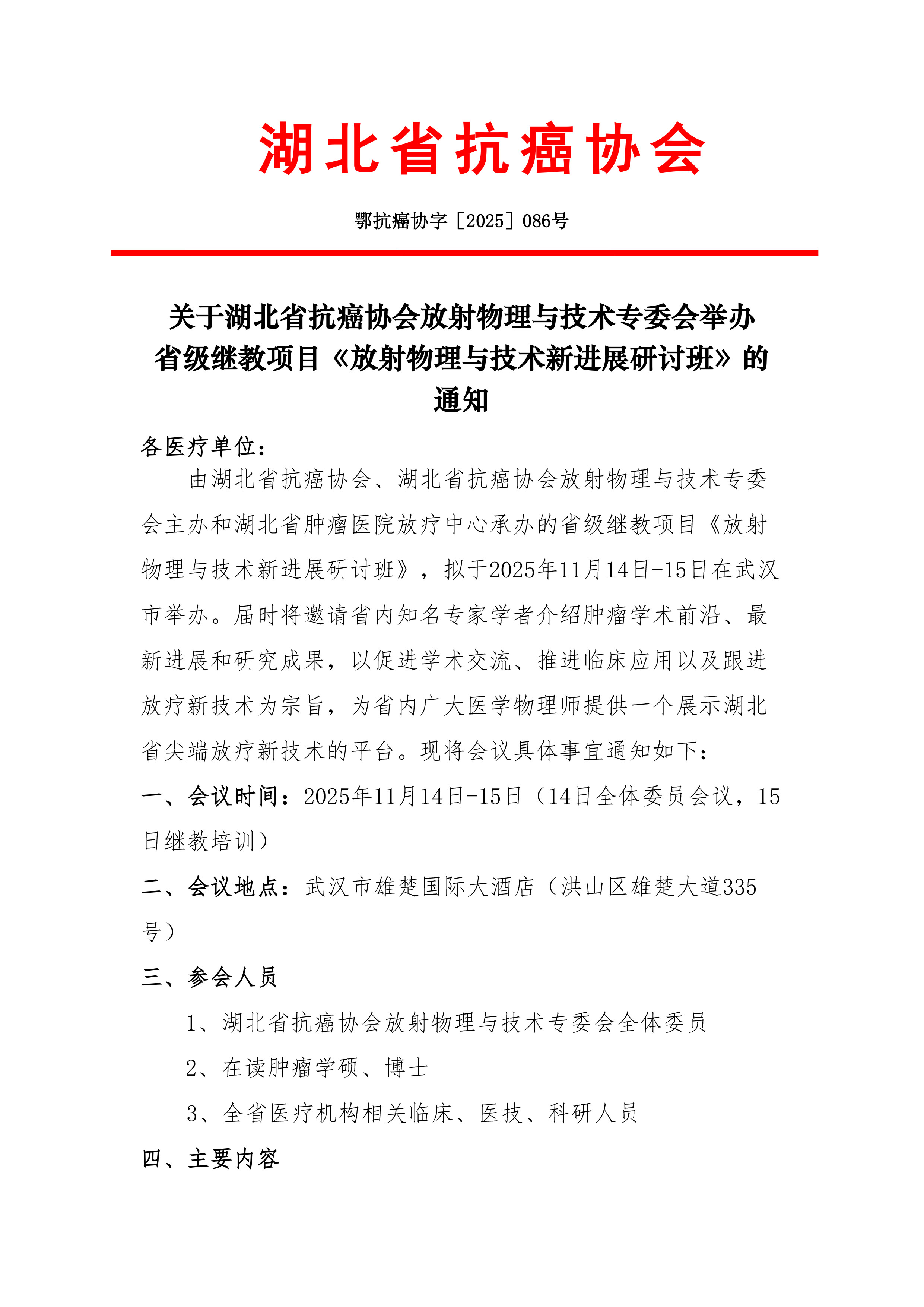 关于湖北省抗癌协会放射物理与技术专委会举办省级继教项目《放射物理与技术新进展研讨班》的通知