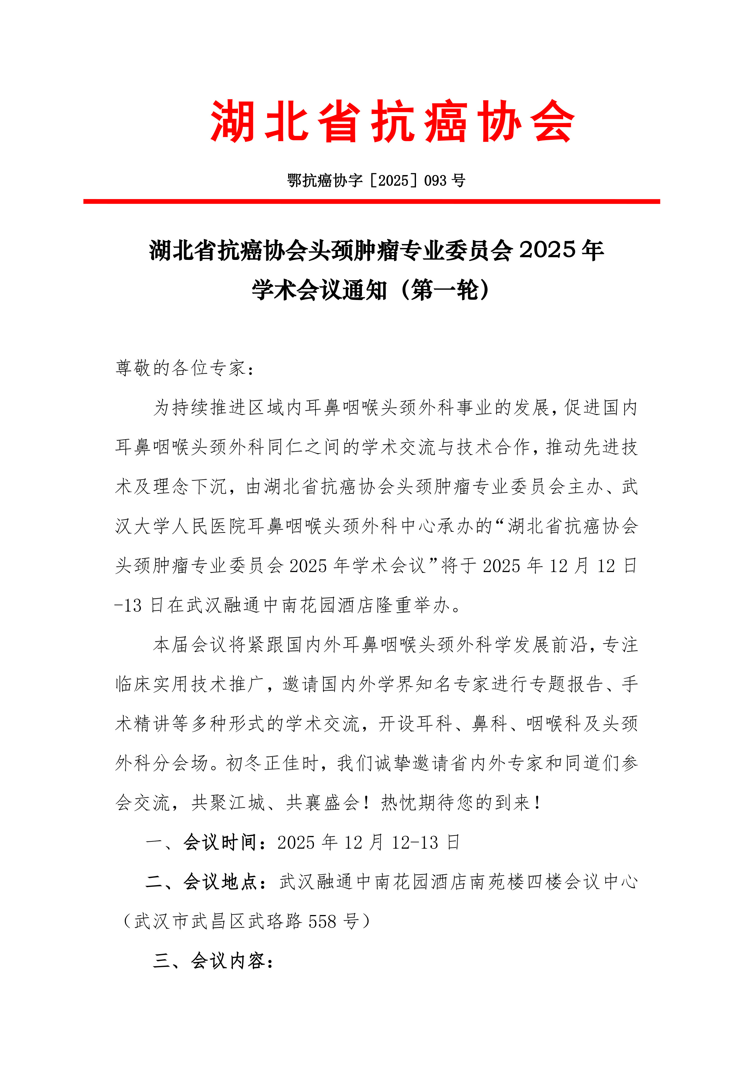 湖北省抗癌协会头颈肿瘤专业委员会2025年学术会议通知(第一轮)