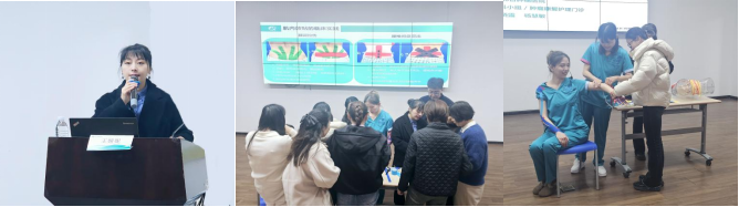 作为开场热身环节,湖北省肿瘤医院肿瘤康复专科护理小组的王娅妮、李晓露、杨慧敏三位护士长带来“肌内贴扎技术基础理论与实践”工作坊。王娅妮护士长系统讲解肌内贴扎技术的材质特性、力学原理及肿瘤患者应用安全要点,明确其在缓解水肿、改善肢体功能等方面的实用价值。随后,李晓露护士长与国际淋巴水肿治疗师杨慧敏针对上肢淋巴水肿、会阴水肿、康复训练相关运动损伤等临床高频场景,分别演示消肿贴扎、轻柔减压型贴扎及稳定支撑型贴扎方法。现场设置互动实操环节,三位老师分组指导学员模拟操作,实时纠正贴扎张力、方向等问题,助力参会者快速掌握核心技能。
