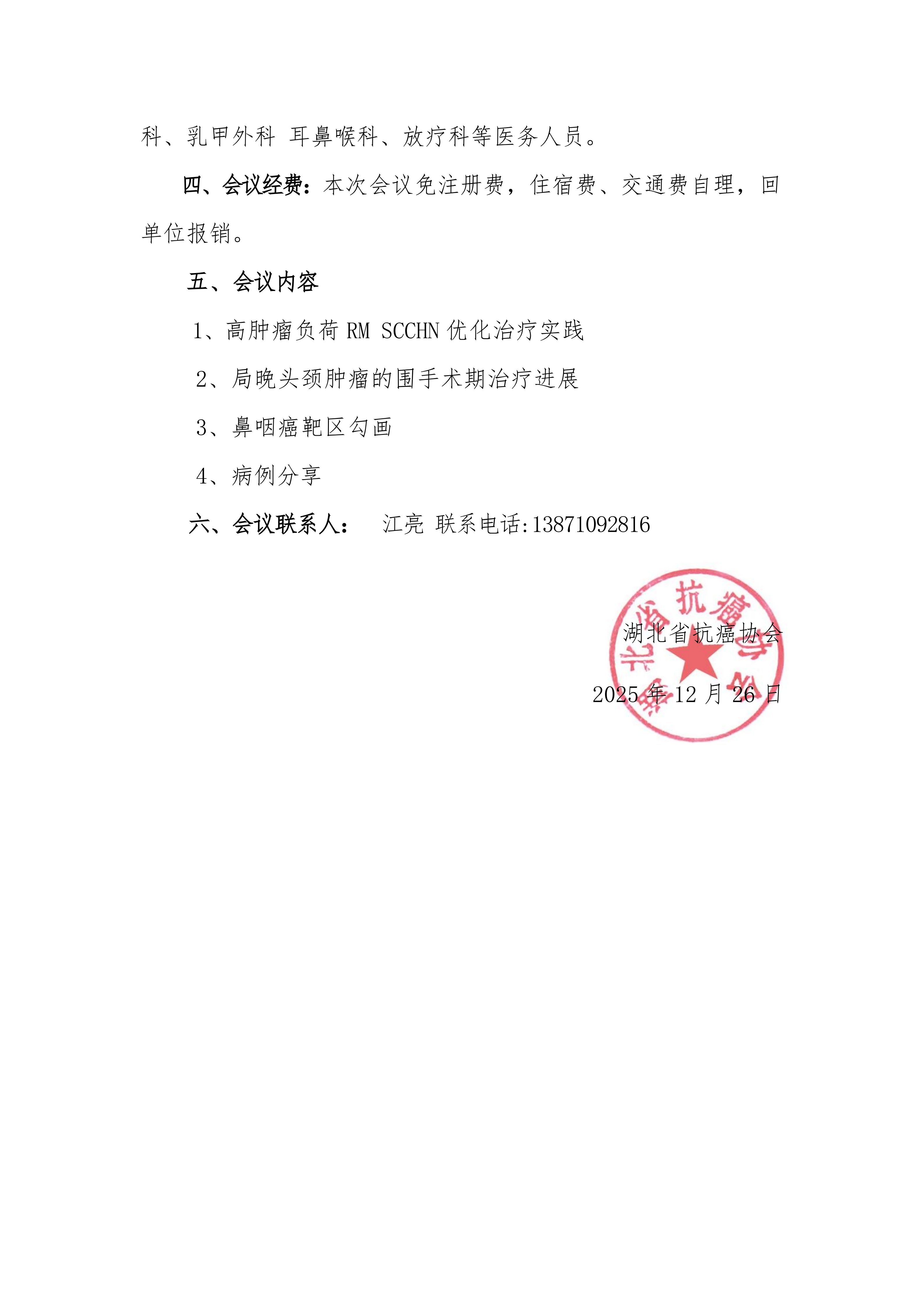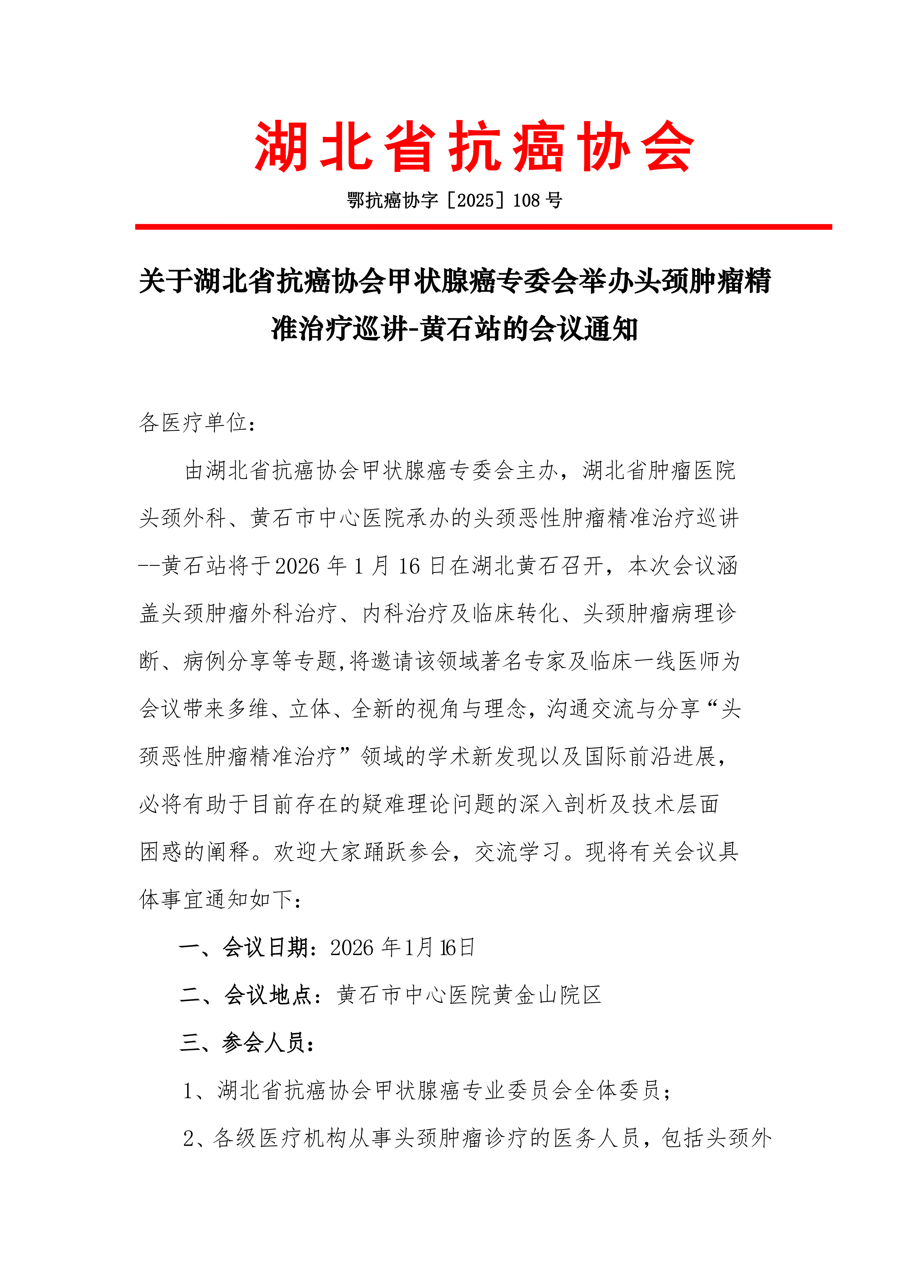 关于湖北省抗癌协会甲状腺癌专委会举办头颈肿瘤精准治疗巡讲--黄石站的会议通知