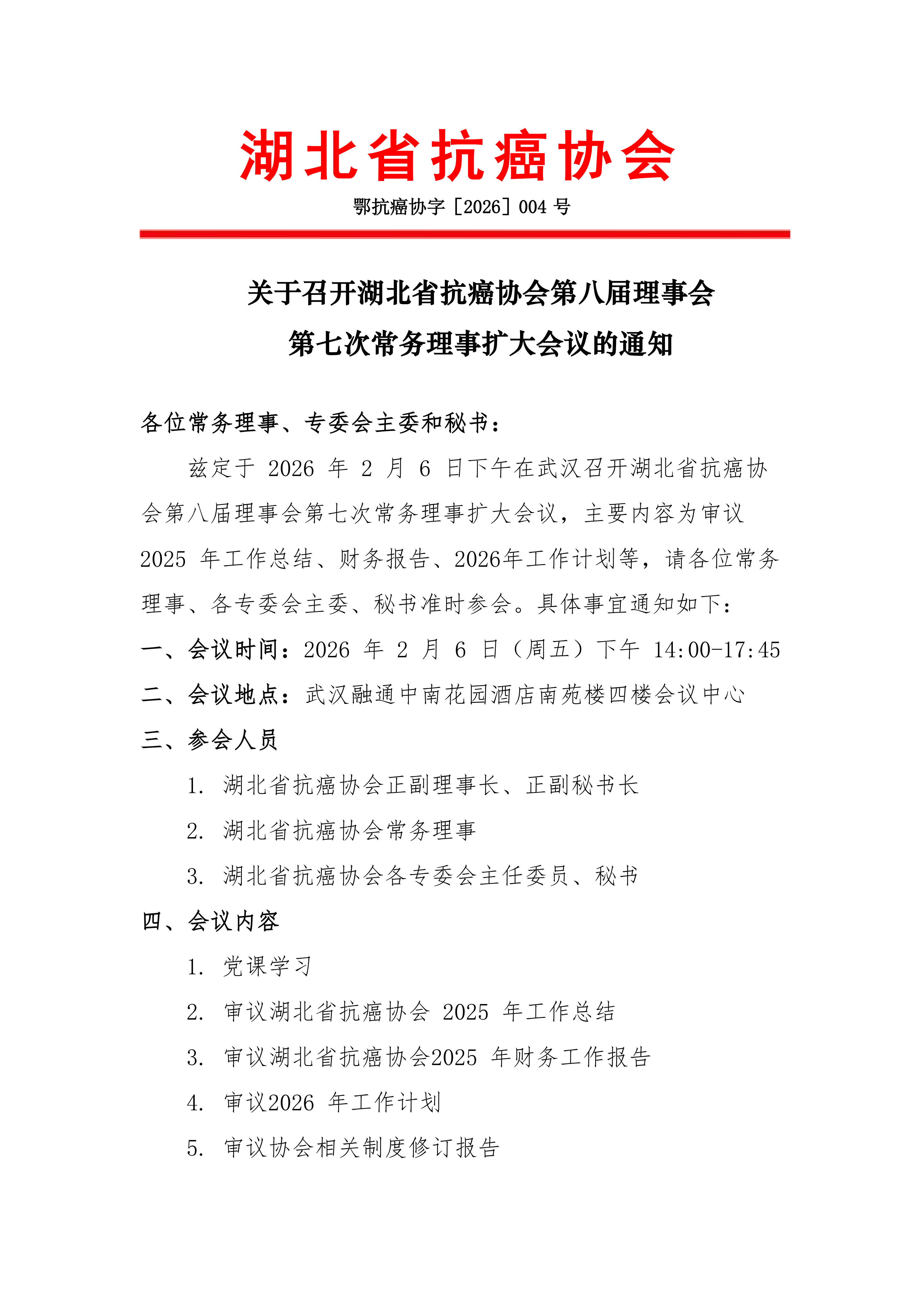 关于召开湖北省抗癌协会第八届理事会第七次常务理事扩大会议的通知