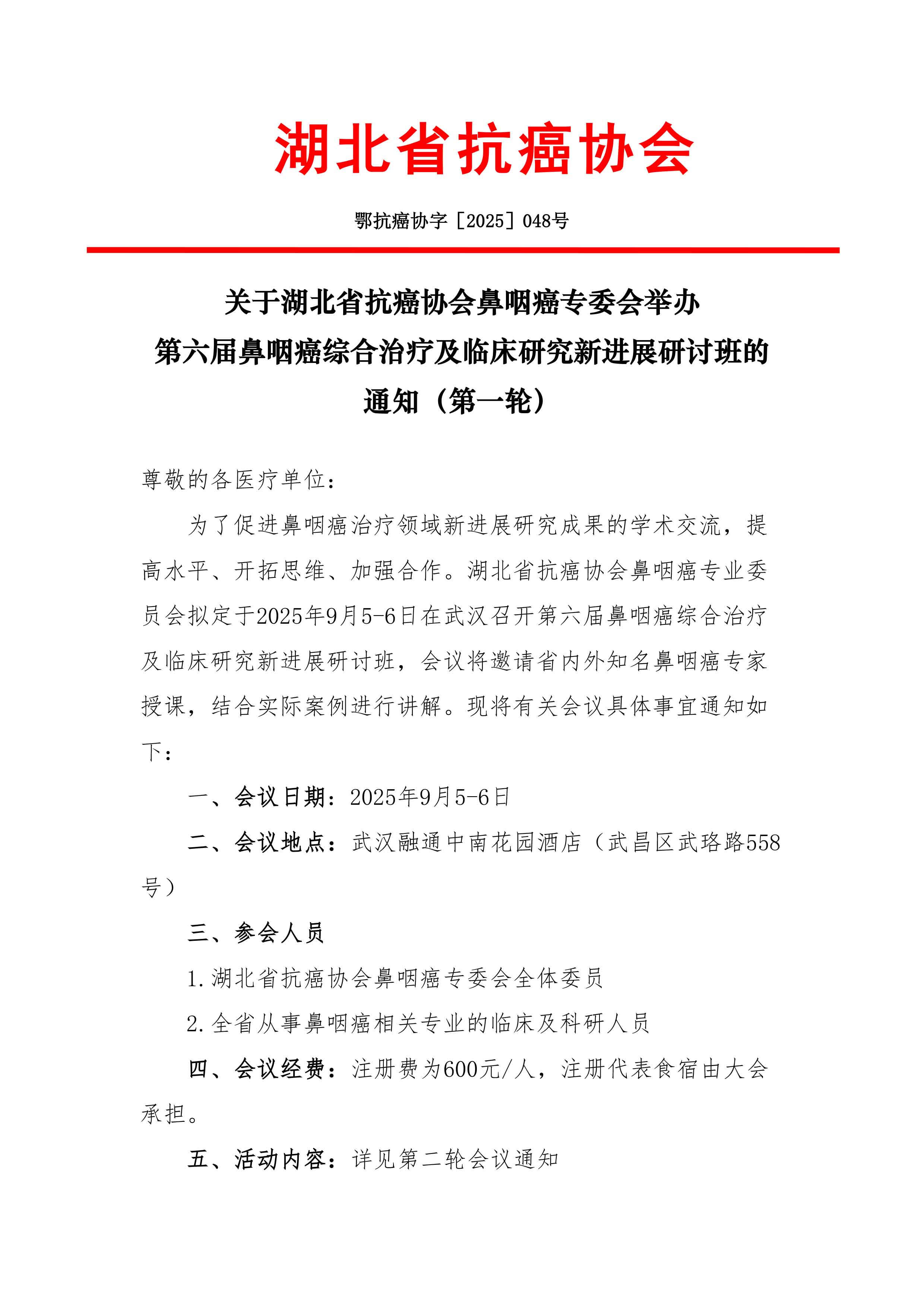 关于湖北省抗癌协会鼻咽癌专委会举办第六届鼻咽癌综合治疗及临床研究新进展研讨班的通知(第一轮)