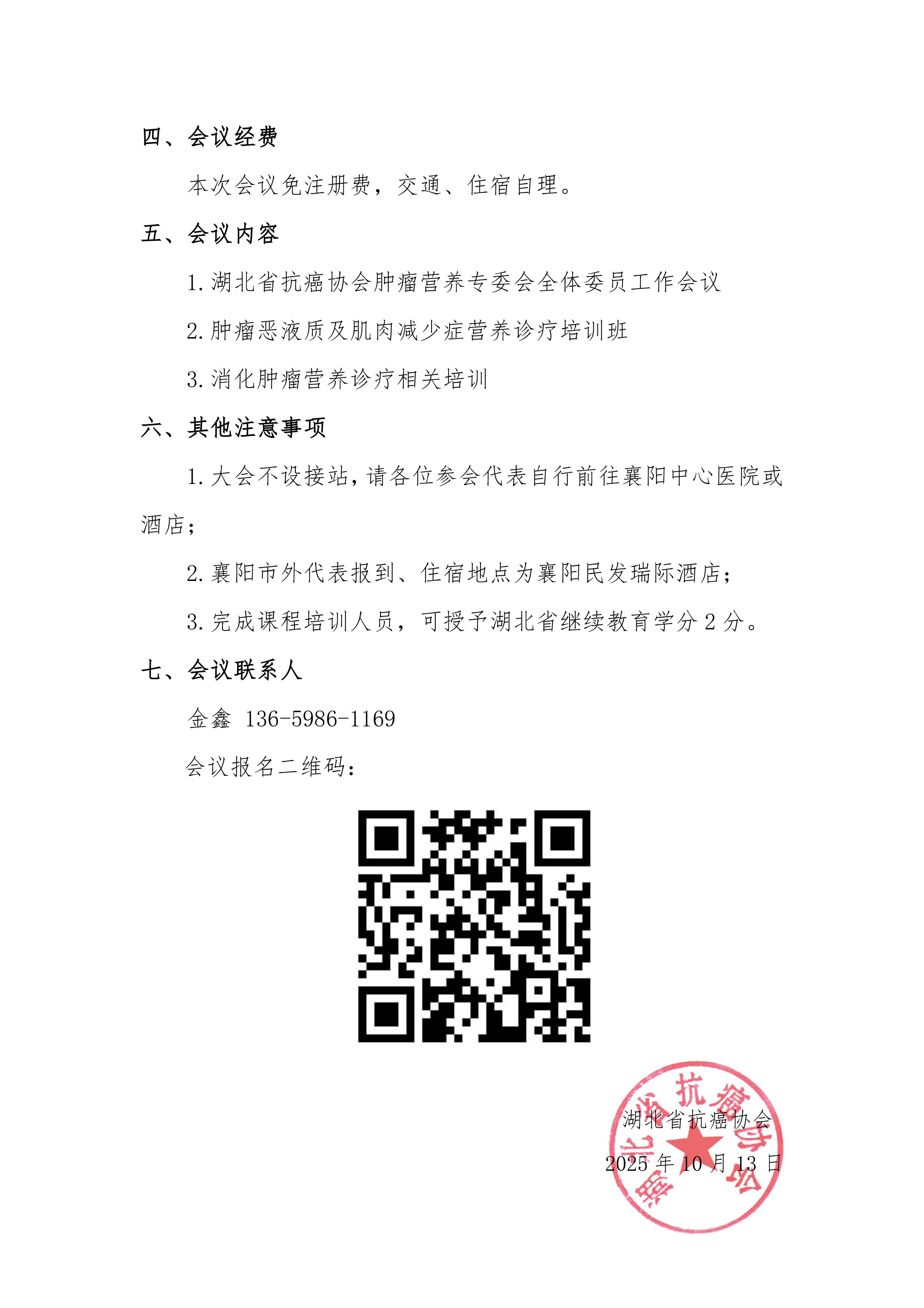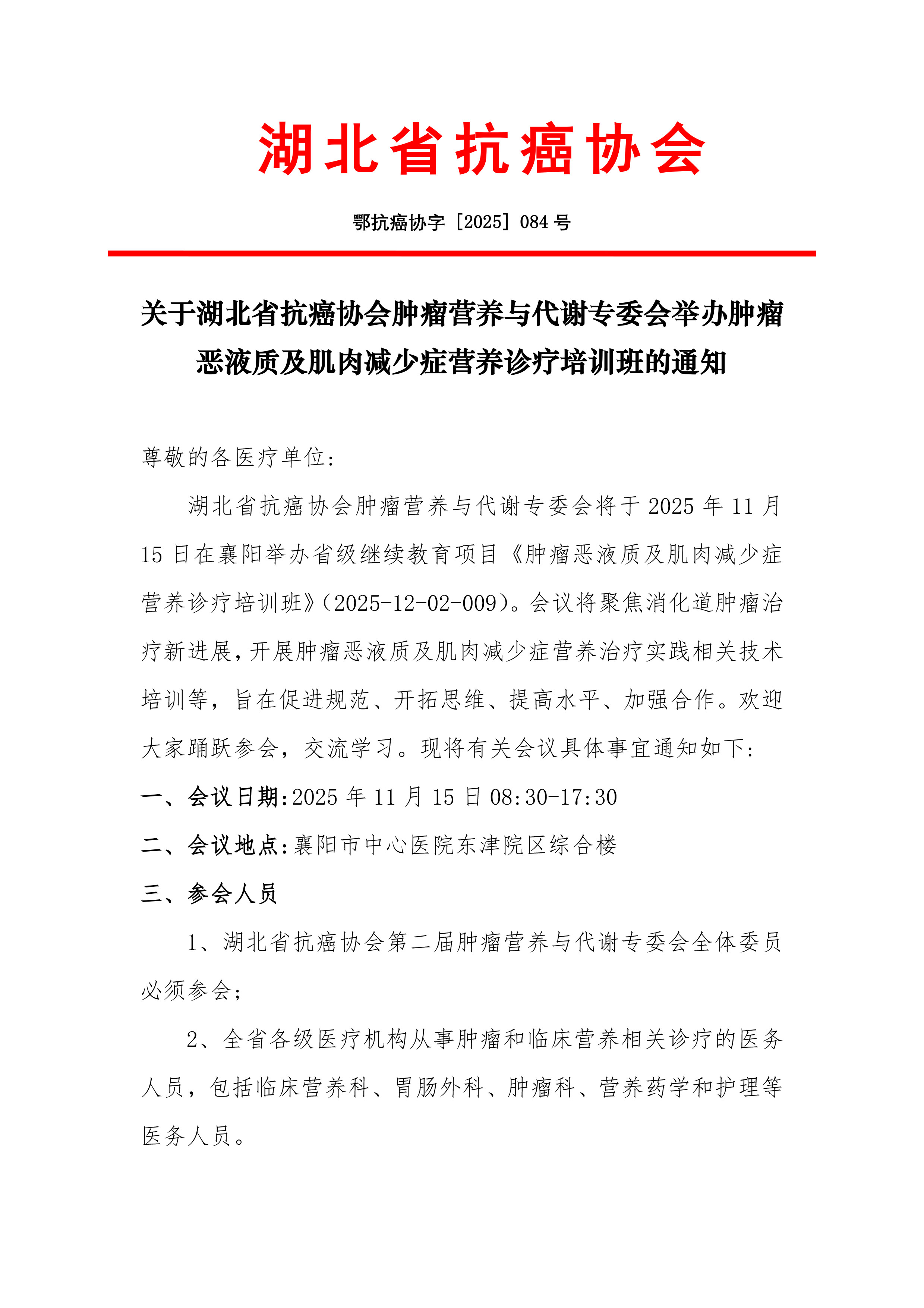 关于湖北省抗癌协会肿瘤营养与代谢专委会举办肿瘤恶液质及肌肉减少症营养诊疗培训班的通知