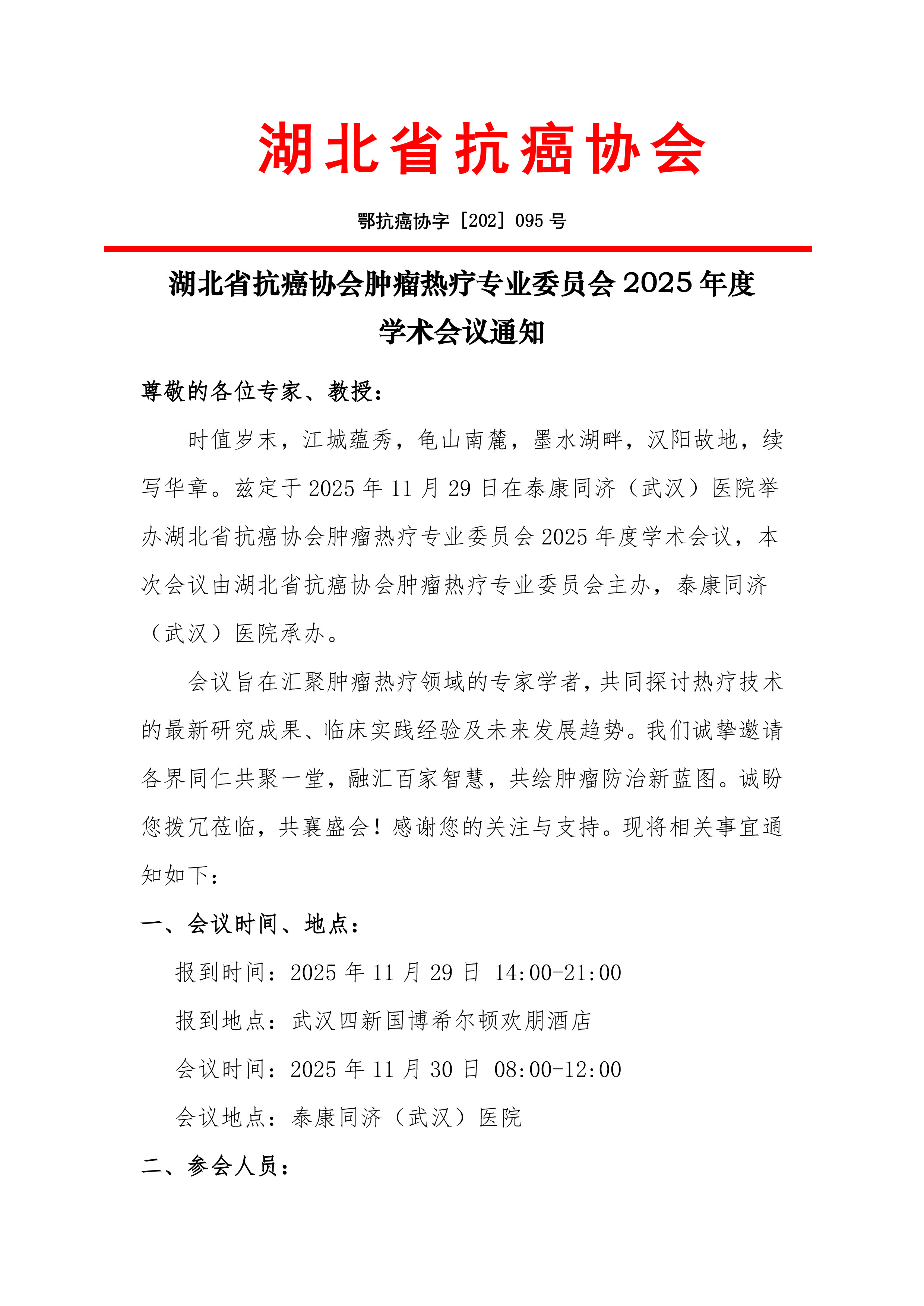 湖北省抗癌协会肿瘤热疗专业委员会2025年度学术会议通知