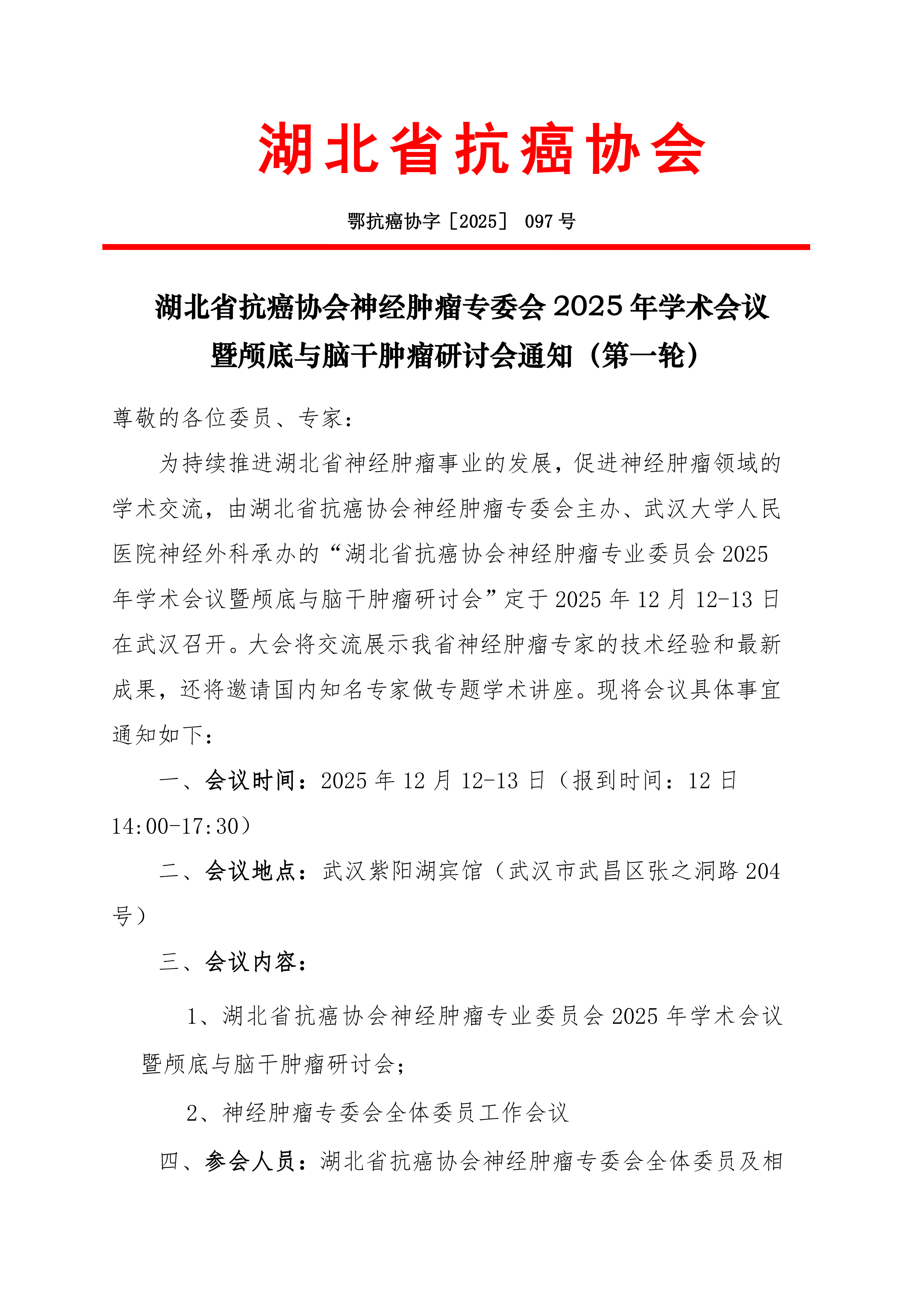 湖北省抗癌协会神经肿瘤专委会2025年学术会议暨颅底与脑干肿瘤研讨会通知(第一轮)