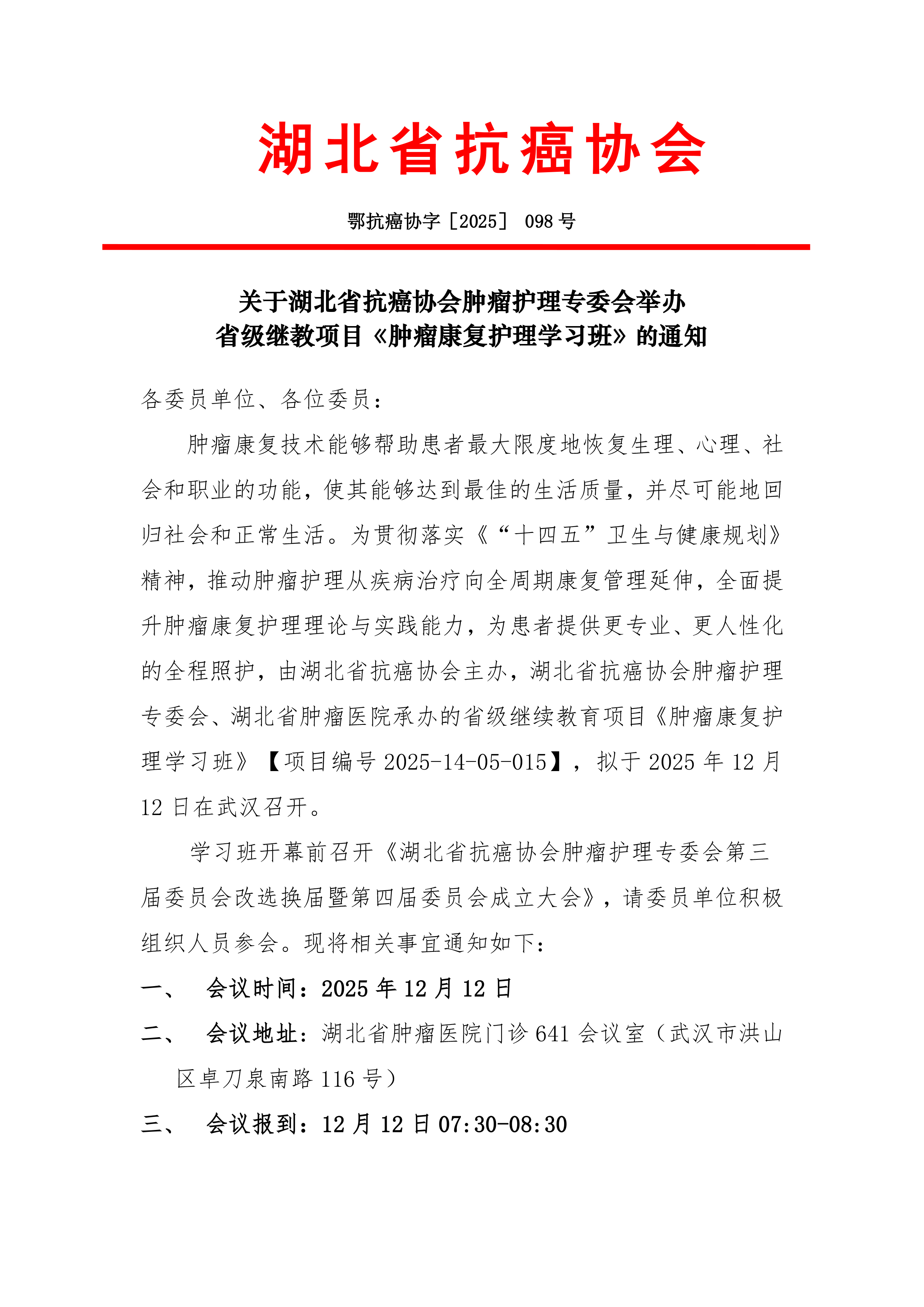 关于湖北省抗癌协会肿瘤护理专委会举办省级继教项目《肿瘤康复护理学习班》的通知