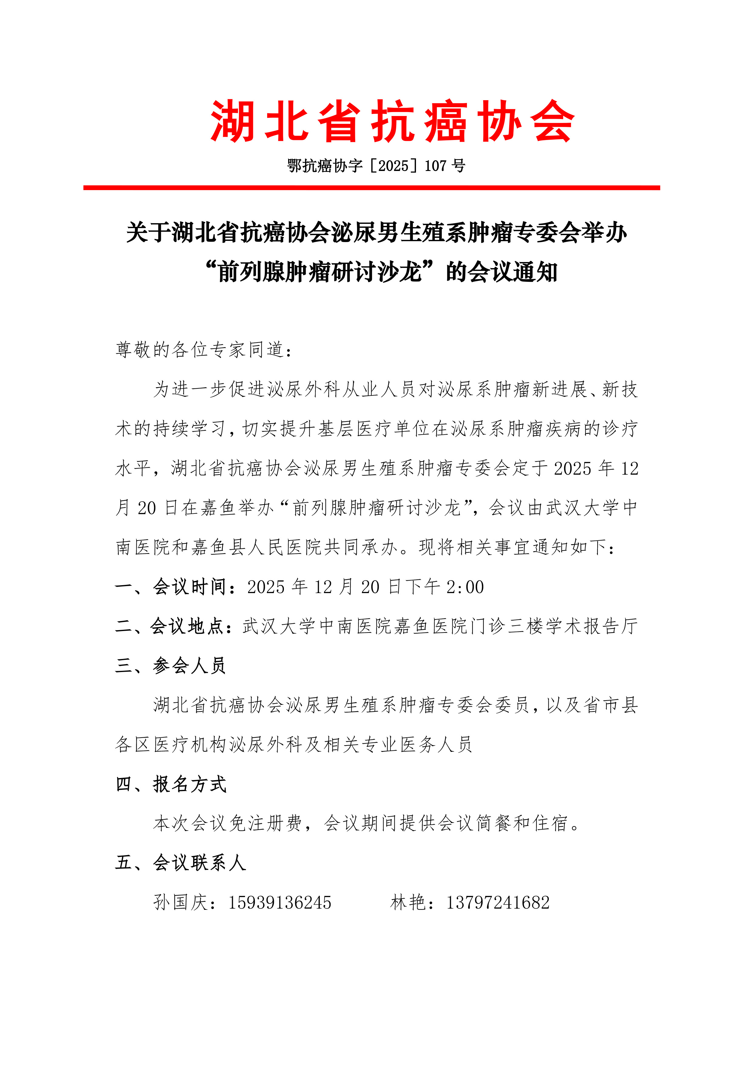 关于湖北省抗癌协会泌尿男生殖系肿瘤专委会举办“前列腺肿瘤研讨沙龙”的会议通知