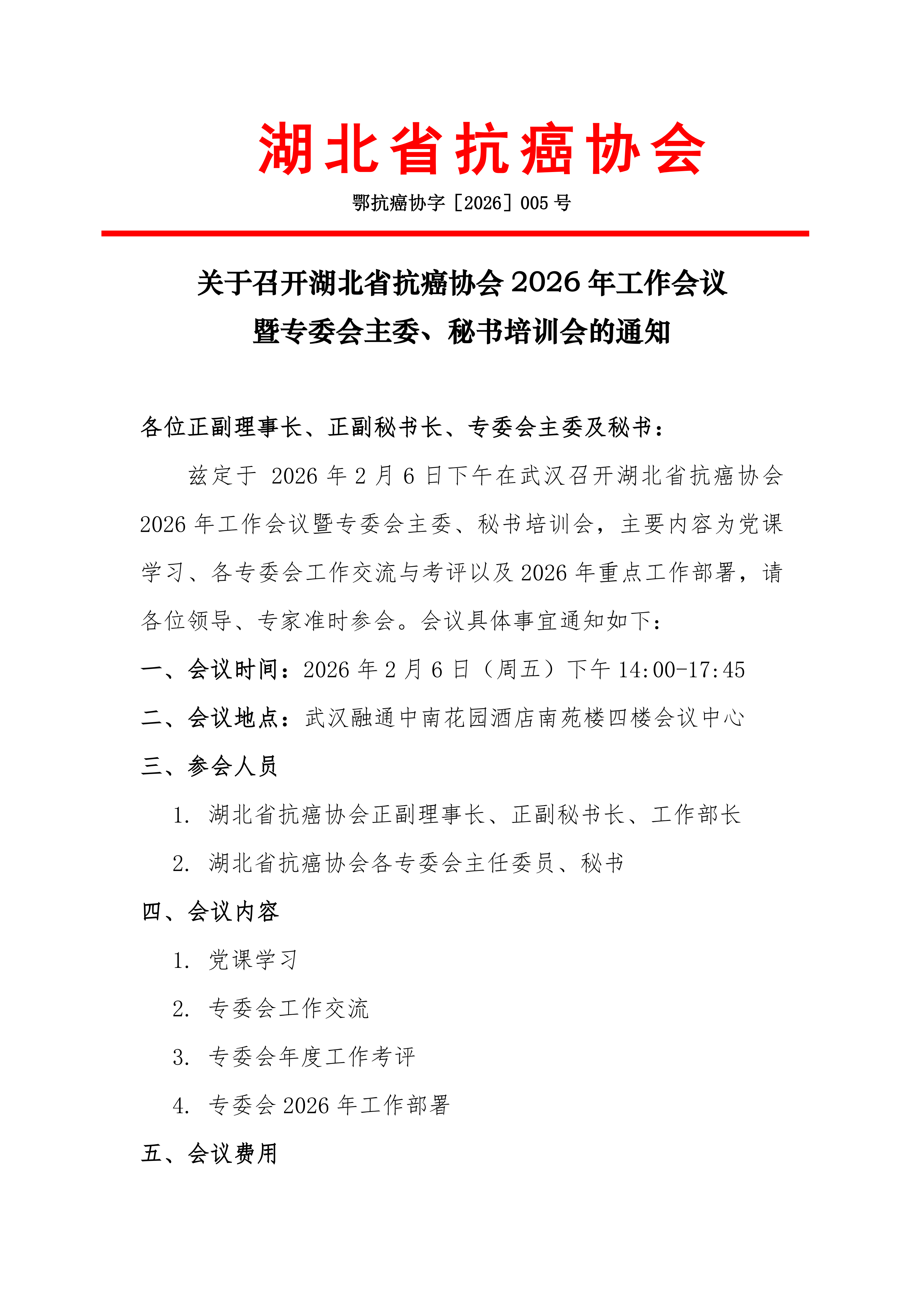 关于召开湖北省抗癌协会2026年工作会议暨专委会主委、秘书培训会的通知