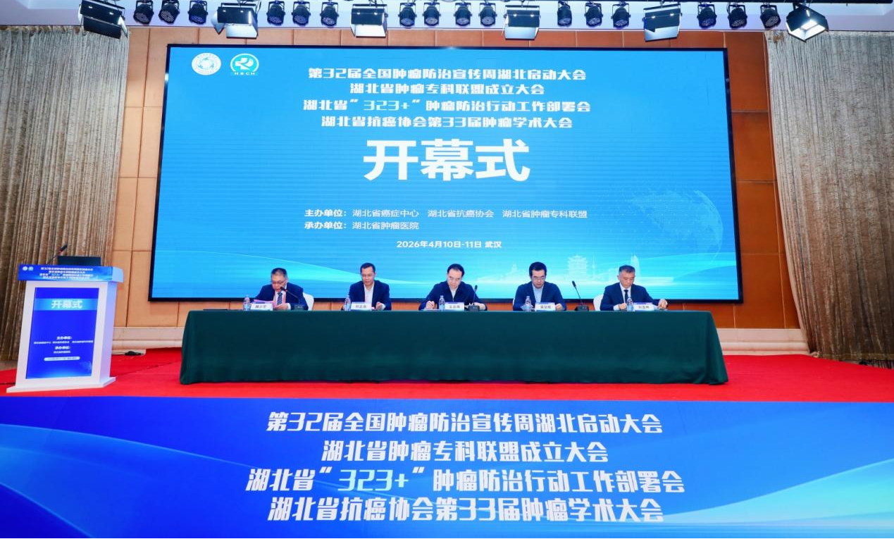 4 月 11 日,第 32 届全国肿瘤防治宣传周湖北启动大会在武汉隆重举行。本次大会以“肿瘤防治 赢在整合”为主题,由湖北省抗癌协会、湖北省癌症中心、湖北省肿瘤专科联盟联合主办,湖北省肿瘤医院承办,同步举办湖北省抗癌协会第33届肿瘤学术大会、湖北省肿瘤专科联盟成立大会、湖北省肿瘤登记数据发布会、湖北省 “323+” 肿瘤防治行动工作部署会,凝聚全省肿瘤防治合力,推动肿瘤防治事业高质量发展。