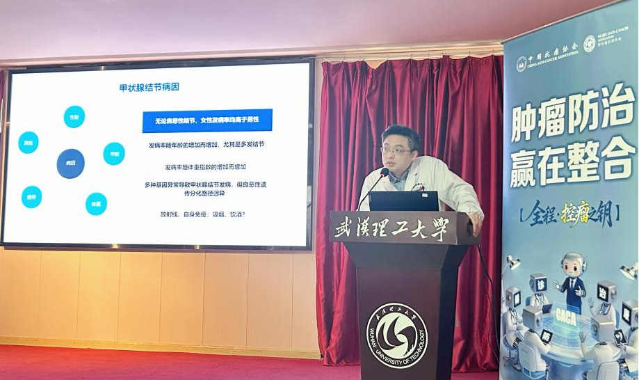 湖北省抗癌协会甲状腺癌专业委员会常委、湖北省肿瘤医院头颈外科副主任梅志丹,以《认识甲状腺结节》为题,从甲状腺癌发病率逐年上升的现象切入,解析了电离辐射、遗传因素、碘摄入与情绪压力等与甲状腺结节癌变相关的风险因素。他特别提醒颈部出现无痛性肿块、声音嘶哑、吞咽不适时应及时就诊。梅主任强调:“绝大多数甲状腺癌预后良好,但科学筛查与规律随访是关键。不必过度恐慌,也切勿忽视身体信号。”