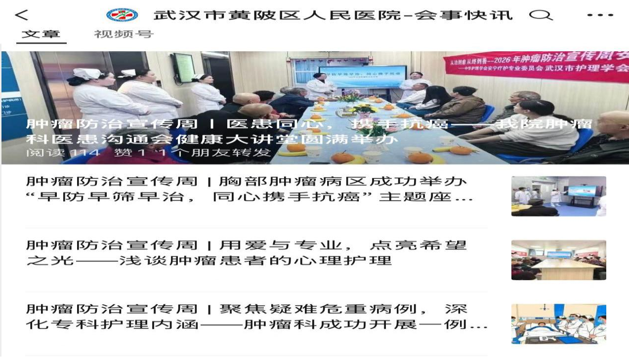 在宣传周期间,肿瘤科依托医院公众号、视频号等新媒体平台,持续推出肿瘤防治科普视频及系列科普文章。内容涵盖癌症预防、高危筛查、规范治疗、康复护理、营养支持、心理调适、癌痛管理等公众关注的热点问题,用通俗易懂的语言、直观生动的画面,将专业医学知识转化为实用健康指引,广泛传播科学防癌理念。